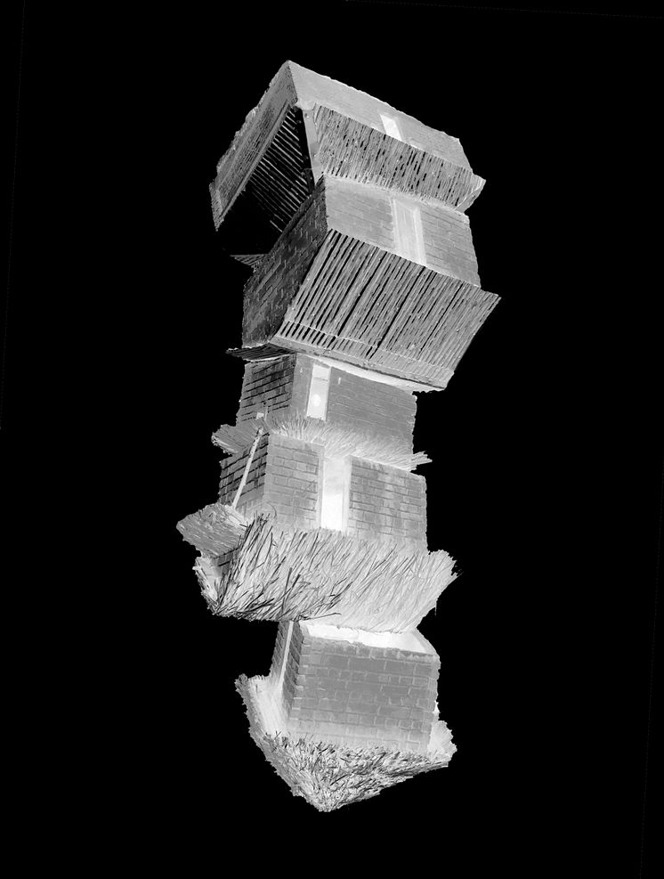 Jag intresserar sig för gränszoner och det som ter sig där bortom, vilket ultimat präglar system och materiella kulturers rörelser och migrationer. I SonAxis återuppstår de kongolesiska missionshyddorna som spöken i en besatt arkitektonisk karneval, avslutar Peyre.