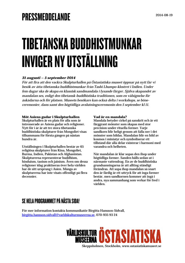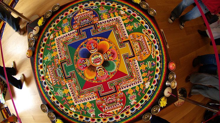 För att fira att den vackra Skulpturhallen på Östasiatiska museet öppnar på nytt får vi besök av åtta tibetanska buddhistmunkar från Tashi Lhumpo-klostret i Indien. Under fem dagar ska de skapa en klassisk sandmandala i lysande färger. Själva skapandet av mandalan ses, enligt den tibetansk-buddhistiska traditionen, som en välsignelse för åskådarna och för platsen. Museets besökare kan också delta i workshops, se böneceremonier, dans samt den högtidliga avslutningsceremonin den 5 september kl 11.