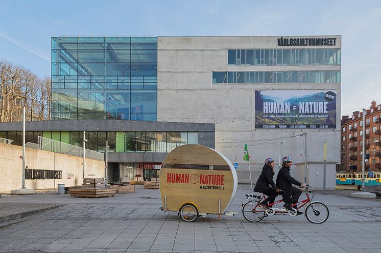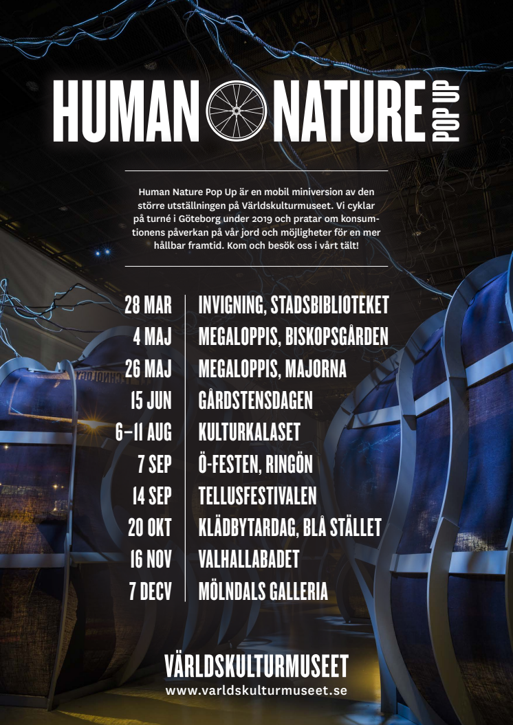 I februari öppnade Human Nature på Världskulturmuseet – en utställning som med utgångspunkt i museets samlingar och tillsammans med flera olika forskningsprojekt handlar om hållbarhet, konsumtion och möjliga omställningar för planetens framtid. Nu invigs den cyklande så kallade pop-up-utställning som ska fungera som en förlängning av Human Nature och bege sig ut på turné i Västsverige under året. Minst tio nedslag ska göras under turnén som startar torsdag den 28 mars på Stadsbiblioteket.