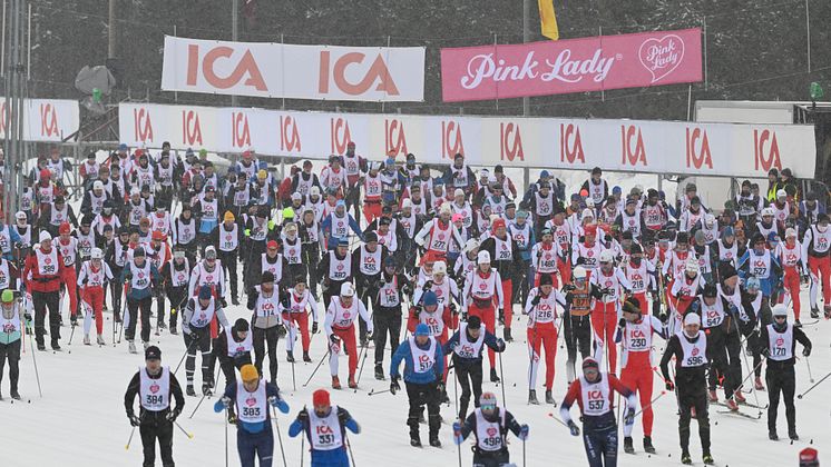 Starten för Vasaloppet 30 2023 i Oxberg med ett lätt snöfall i luften.
