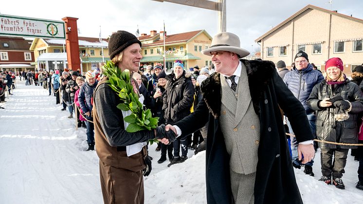 Jubileusmvasan Erik Wickström gratuleras av Vasaloppets vd Johan Eriksson