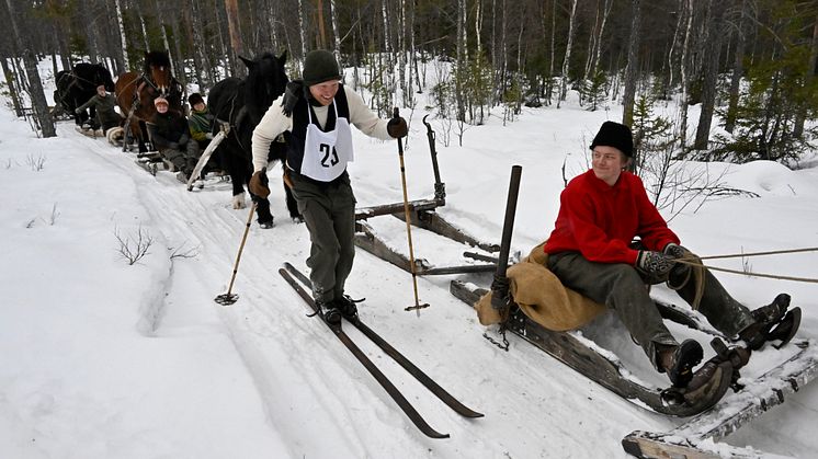 Jubileumsvasan nr 29 Per Holm från Mora kör förbi forkörare i skogen