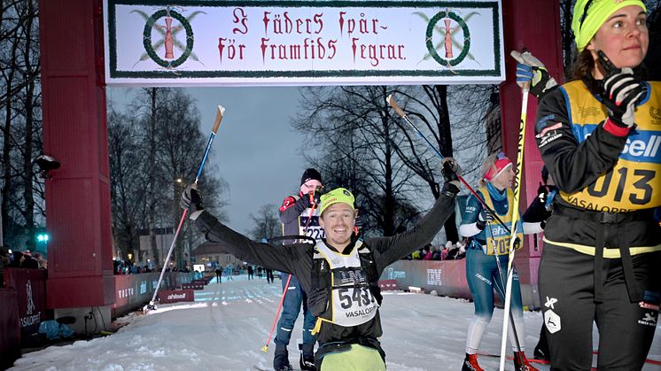 Först i mål: Bruno Dettman, Orsa, och Emma Hållström, Uppsala, var första man respektive kvinna i mål i det första loppet, Vasaloppet 30. Bruno var även 41:a i Vasaloppet och Emma 62:a.
