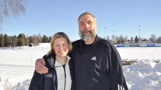 – Eftersom jag har 51 i skostorlek så bromsade skidskorna lite i spåren. Men se inte det som någon bortförklaring. Du var bäst i dag, säger Juha Mieto som sedan skrattar och ger Marjo en kram.