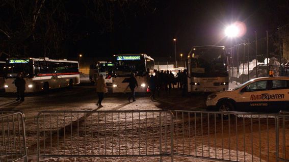 De allra flesta av de cirka 2700 bussresenärerna hade köpt biljetten i förväg. Endast 200 personer köpte biljett direkt på morgonen. Inpasseringen sker genom ett tält där biljetten läses av, varpå åkarna går vidare i fållor där de leds rätt av personer som visar vägen till bussen. När bussarna är fyllda åker de iväg och nya bussar rullar fram.