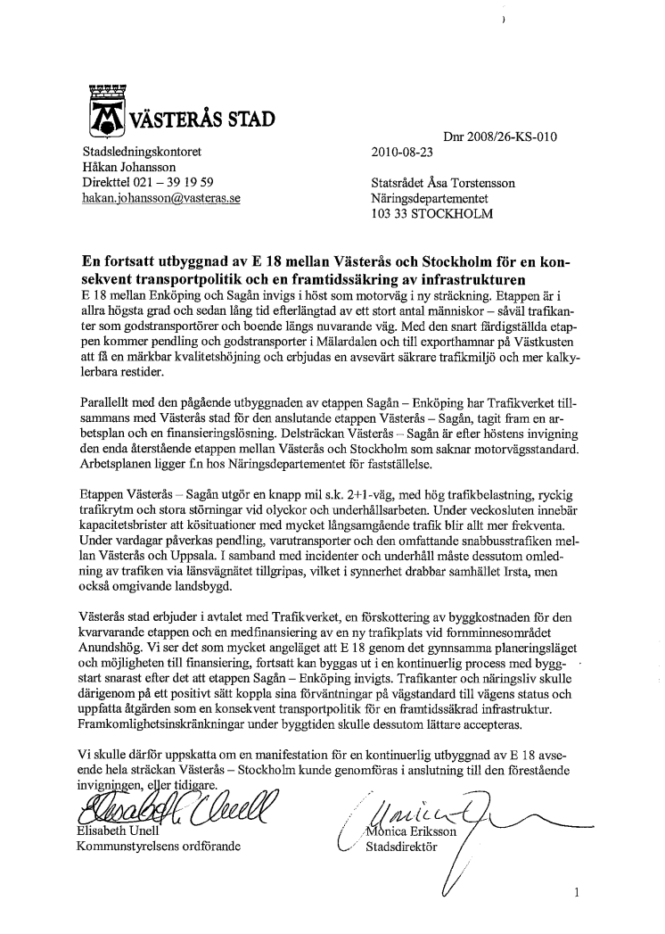 Elisabeth Unell, kommunstyrelsen ordförande, och Monica Eriksson, stadsdirektör, har vänt sig till Åsa Torstensson, infrastrukturminister, i ett upprop för en fortsatt utbyggnad av E 18 mellan Västerås och Stockholm.