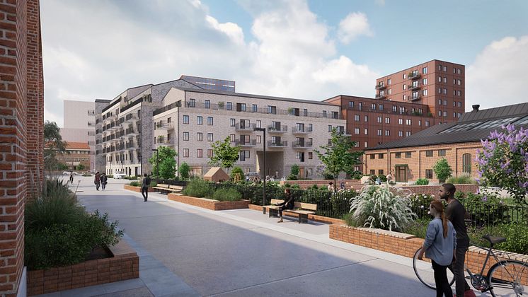 En illustration av en del av det framtida parkstråket som är tänkt att bli där Metallverksgatan går idag. Till höger i bild Gjuteriet och till vänster skymtar Valsverkets tegelfasad. Metallverksgatan kommer att flyttas och gå längs med järnvägen. Illustration: Dreem Arkitekter