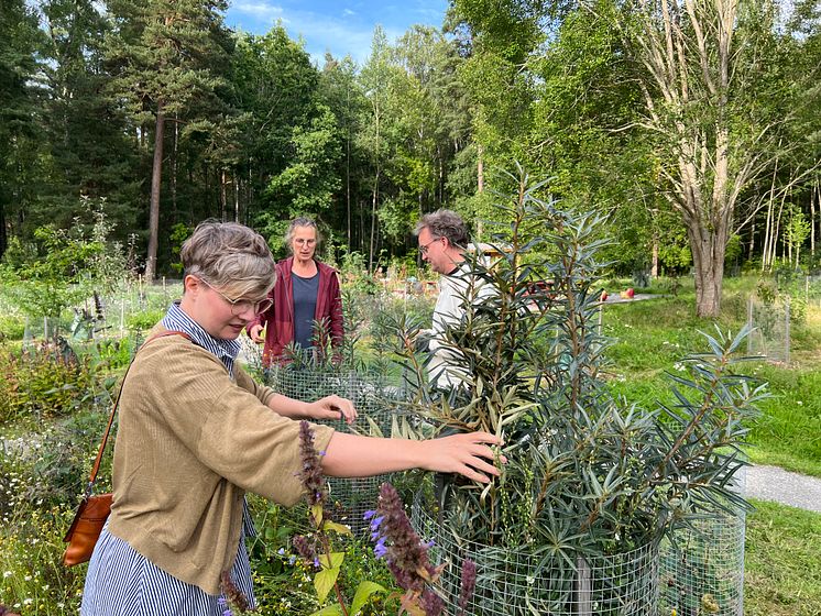 Landskapsarkitekt Petra Löfgren, landskapsingenjör Sara Ellström och skogsvaktare Jörgen Gustafsson arbetar alla med Malmaberg matskog.