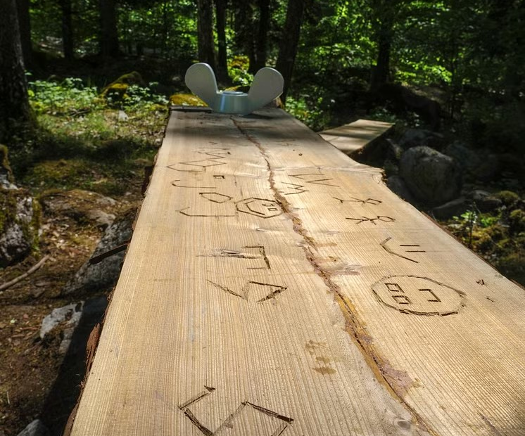 Detalj spång med bomärken av elever från Gäddeholmsskolan, Skogsportalen – Spår, Pia Sandström, 2024