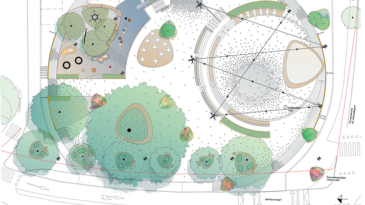 Det ska bli inbjudande grönska, sittmöjligheter, en spännande lekplats och en scen. Området blir dessutom mer tillgängligt i och med att trappan till entrén tas bort.