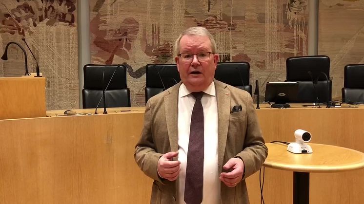 -Sen klockan 21.30 kommer ett reducerat fullmäktige med 33 ledamöter att samlas här i fullmäktigesalen med avstånd, och ta besluten. Vi har coronasäkrat den delen av mötet på sådant sätt att vi kommer att sitta med stora avstånd. Vi kommer att ha munskydd på. Vi erbjuder också de som vill att ta ett snabbtest, ett självtest, för att se om man är corona-positiv. Det är de åtgärder vi har vidtagit. I övrigt så gäller ju restriktionerna. Det handlar om att tvätta händerna, hålla avstånd och ingen får komma hit till stadshuset som har minsta symtom på sjukdom, säger Anders Teljebäck.