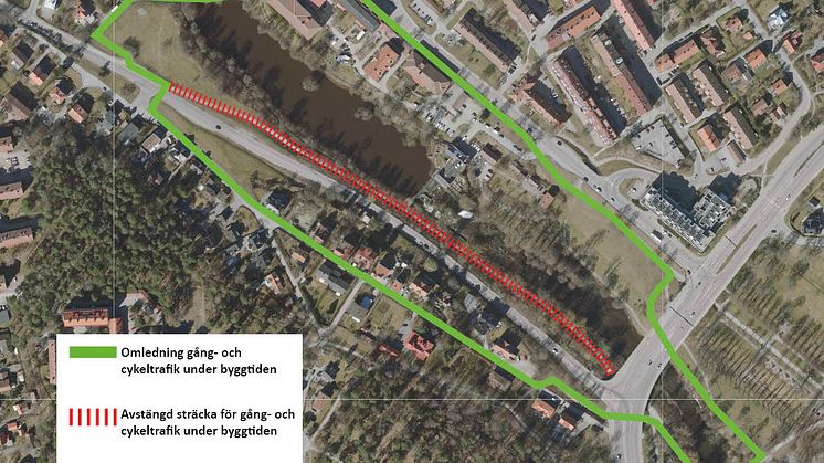 Gång- och cykelvägen längs västra sidan av Svartån, mitt emot Falkenbergska kvarnen kommer att användas som byggväg och stängs av under byggtiden. I stället leds gång- och cykeltrafiken om via Lustigkulla på västra sidan och Karlslund på östra sidan. Gång- och cykelvägen görs i samband med detta också lite bredare så att framkomligheten för både cyklister och fotgängare blir bättre.