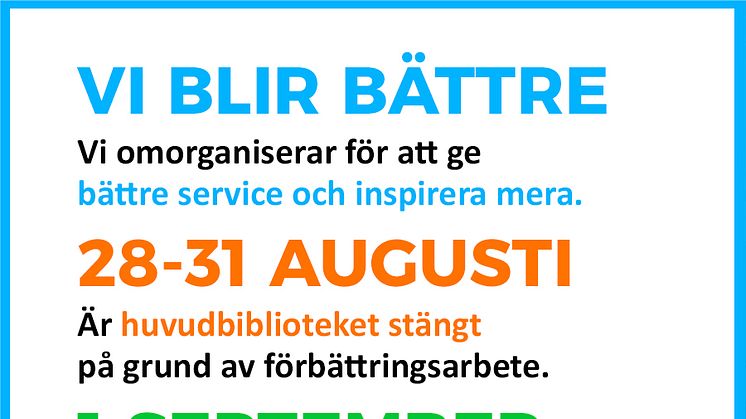 Huvudbiblioteket stängs mån-tors 28-31 augusti på grund av förbättringsarbete. Anledningen är en omorganisation, på just huvudbiblioteket, med syfte att skapa en organisation som tydligt knyter upp till bibliotekens uppdrag och lagkrav: "Bibliotek är en resurs som ger alla fri tillgång till information, kunskap och kultur och som inspirerar till att ta del av det. Därmed ges människor möjlighet att använda sin demokratiska rättighet att utvecklas, tänka, läsa, tala och skriva fritt."