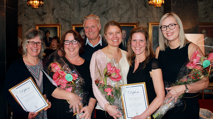 Annette Isaksson, Maria Ryttersson och Mats Keijser, gymnasieenheten, Skultuna kommundelsförvaltning, Johanna Malmer Wallenius, Viksängsskolan, samt Linda Bjällerstedt och Sara Bergström, Bjurhovdasmyckets förskola har idag tagit emot Pedagogiska priset 2017.