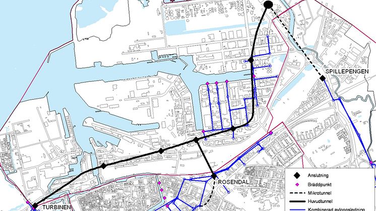 Karta över tänkt sträckning av Malmö avloppstunnel