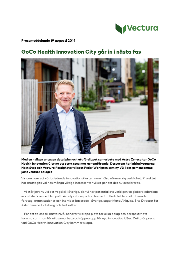 Med en nyligen antagen detaljplan och ett fördjupat samarbete med Astra Zeneca tar GoCo Health Innovation City nu ett stort steg mot genomförande. Dessutom har initiativtagarna Next Step och Vectura Fastigheter tillsatt Peder Wahlgren som ny VD i det gemensamma joint venture bolaget.