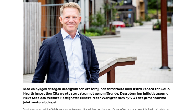Med en nyligen antagen detaljplan och ett fördjupat samarbete med Astra Zeneca tar GoCo Health Innovation City nu ett stort steg mot genomförande. Dessutom har initiativtagarna Next Step och Vectura Fastigheter tillsatt Peder Wahlgren som ny VD i det gemensamma joint venture bolaget.