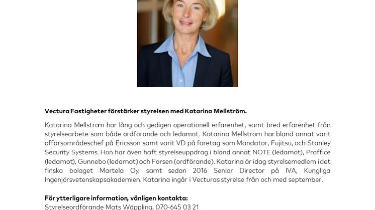 Katarina Mellström har lång och gedigen operationell erfarenhet, samt bred erfarenhet från styrelsearbete som både ordförande och ledamot. Katarina Mellström har bland annat varit affärsområdeschef på Ericsson samt varit VD på företag som Mandator, Fujitsu, och Stanley Security Systems. Hon har även haft styrelseuppdrag i bland annat NOTE (ledamot), Proffice (ledamot), Gunnebo (ledamot) och Forsen (ordförande). Katarina är idag styrelsemedlem i det finska bolaget Martela Oy, samt sedan 2016 Senior Director på IVA, Kungliga Ingenjörsvetenskapsakademien. Katarina ingår i Vecturas styrelse från och med september.