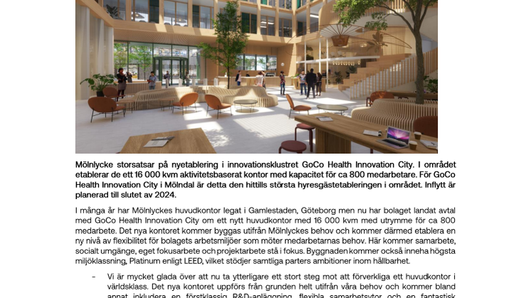 - Vi är mycket glada över att nu ta ytterligare ett stort steg mot att förverkliga ett huvudkontor i världsklass. Det nya kontoret uppförs från grunden helt utifrån våra behov och kommer bland annat inkludera en förstklassig R&D-anläggning, flexibla samarbetsytor och en fantastisk arbetsmiljö. Att vi nu tar plats i GoCo Health Innovation City innebär också att vi knyter oss ännu närmare Göteborgs ledande life science-kluster, vilket ytterligare understöder vår utvecklingsintensiva verksamhet och vår ambition om att bli en global ledare inom medicintekniska produkter och lösningar, för att supportera våra kunder ännu bättre, säger Zlatko Rither, VD på Mölnlycke Health Care.