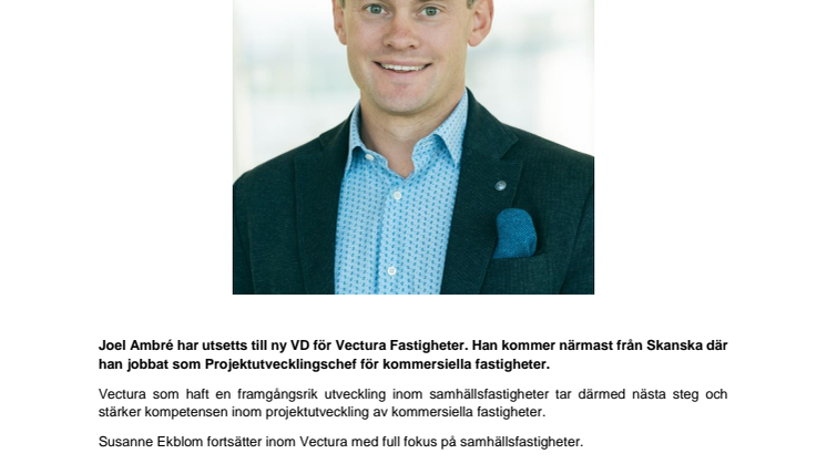 Joel Ambré har utsetts till ny VD för Vectura Fastigheter. Han kommer närmast från Skanska där han jobbat som Projektutvecklingschef för kommersiella fastigheter.