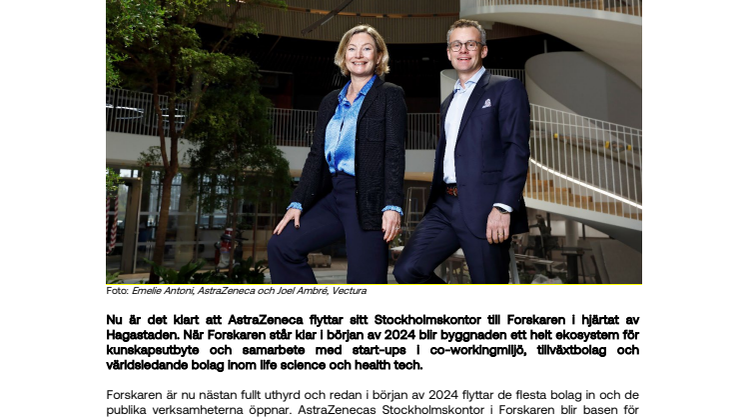- Det är glädjande att AstraZeneca nu väljer Forskaren, vilket kommer att stärka vårt erbjudande inom life science ytterligare. Vi är övertygade om att det utbyte som sker i Hagastaden mellan hälso- och sjukvården, akademin och näringslivet inte bara stärker Stockholmsregionen, utan hela Sveriges konkurrenskraft, säger Joel Ambré, vd på Vectura. Tillsammans kommer vi nu att fortsätta vårt strategiska samarbete i både Forskaren och GoCo Health Innovation City för att sätta life science från Sverige på kartan globalt.