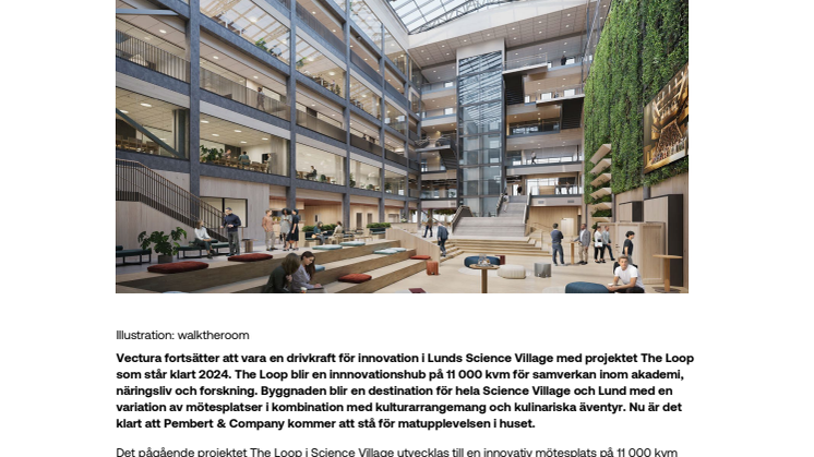 Vectura fortsätter att vara en drivkraft för innovation i Lunds Science Village med projektet The Loop som står klart 2024. The Loop blir en innnovationshub på 11 000 kvm för samverkan inom akademi, näringsliv och forskning. Byggnaden blir en destination för hela Science Village och Lund med en variation av mötesplatser i kombination med kulturarrangemang och kulinariska äventyr. Nu är det klart att Pembert & Company kommer att stå för matupplevelsen i huset.