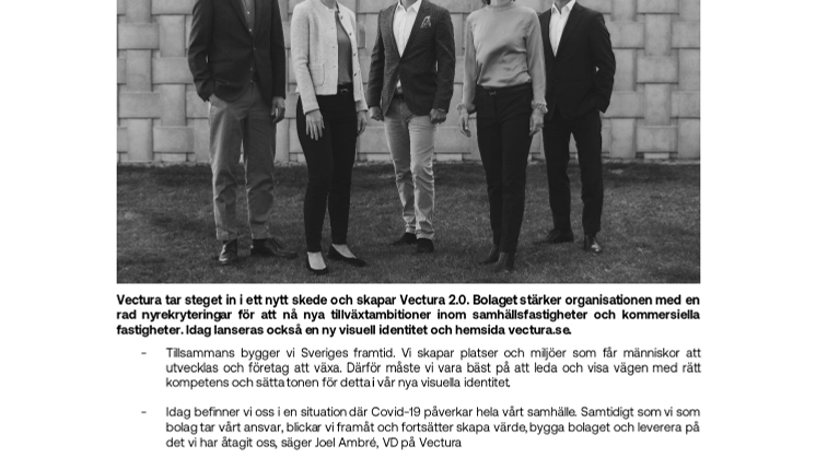 Sedan bolagets VD Joel Ambré tillträdde har en rad nyrekryteringar gjorts och under våren har två nya ledningsgruppsmedlemmar Katarina Fu och Petter Ekevärn tillträtt. Katarina Fu går in i rollen som Affärsenhetschef Samhällsfastigheter. Katarina kommer närmast från ALM Equity där hon har arbetat som Gruppchef inom bostadsutveckling och har även en bakgrund inom transaktioner. Petter Ekevärn intar rollen som Projektutvecklingschef och kommer senast från Skanska där han arbetat som Distriktschef på entreprenadsidan för kommersiella projekt, men har även lång erfarenhet av samhällsfastigheter. Ledningsgruppen består sedan tidigare även av Micael Averborg och Johanna Klint. Micael Averborg blir Affärsenhetschef Kommersiella fastigheter och har innan Vectura arbetat 15 år på Atrium Ljungberg. Johanna Klint är bolagets CFO och kommer innan tiden på Vectura senast från Investor.