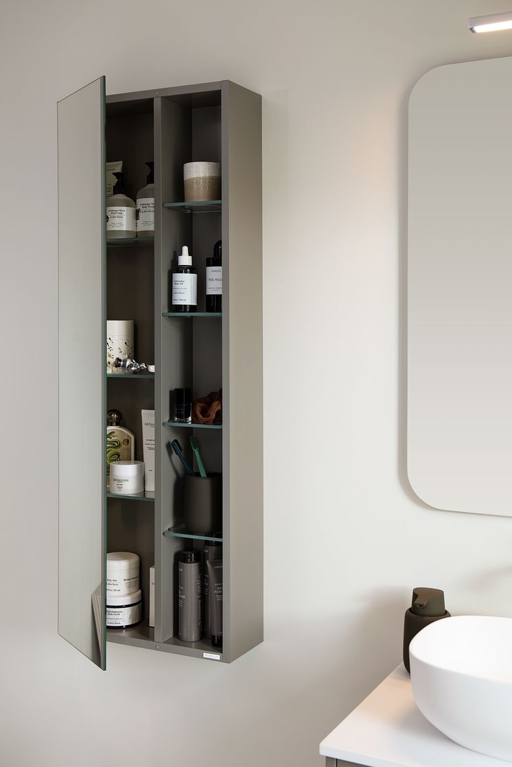 Soprano Frame 610 betonggrå kombineras här med öppen och dold förvaring i ett halvhögt skåp med spegel.