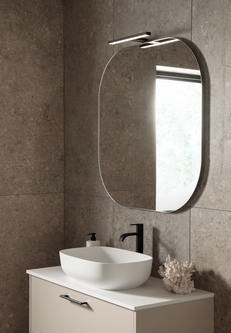 Kvadratiska spegeln Grann med mjuka rundade hörn. Här tillsammans med Soprano Frame 910 i linnebeige.