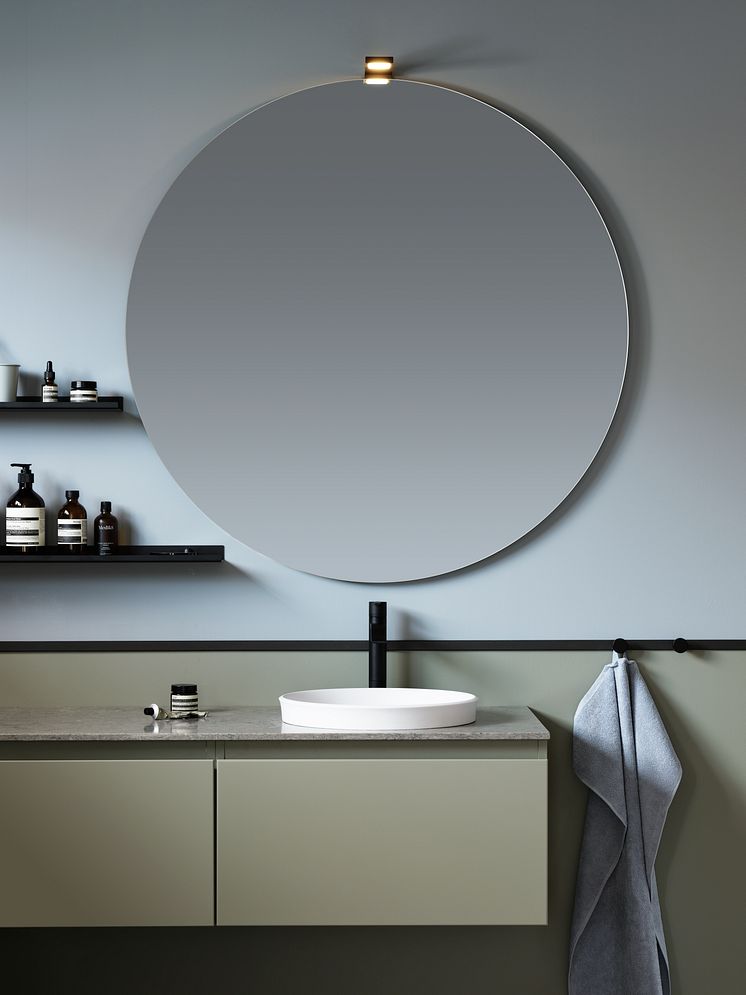 Himmelsblått möter grönska i ett badrum med rymd och taktila material.