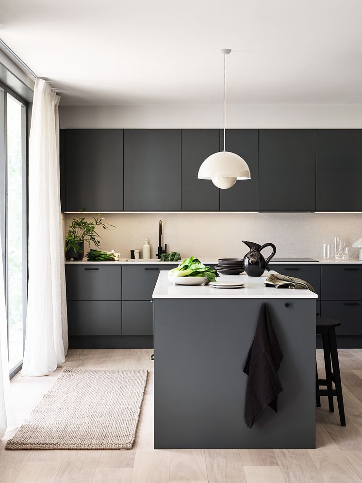 Ett sobert kök med raka linjer, stora arbetsytor och praktisk funktionsvägg.