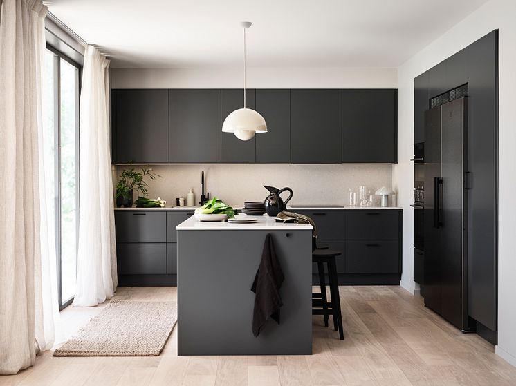 Ett sobert kök med raka linjer, stora arbetsytor och praktisk funktionsvägg.