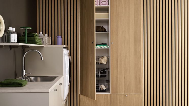 När det svenska familjeföretaget Vedum Kök & Bad presenterar årets tvättstugenyheter går form och funktion hand i hand. I den nya miljön möter den släta luckan Maja i linnebeige en praktisk förvaringsvägg med luckan Molly i vitpigmenterad ek – tillsammans bildas en lugn, modern och naturnära känsla. Tvättstugan är framtagen för att ge det bästa av funktion och design på liten yta.