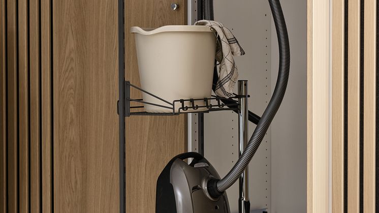 Ledorden i framtagandet av den nya miljön har varit ergonomi, funktionalitet och estetik vilket blir tydligt i såväl detaljer som helhet. Det är den smarta förvaringsväggen i trä ett tydligt bevis på – här finns det gott om utrymme för hemmets alla nödvändiga prylar, som dammsugare, tvättmedel och annat men behöver till städet.