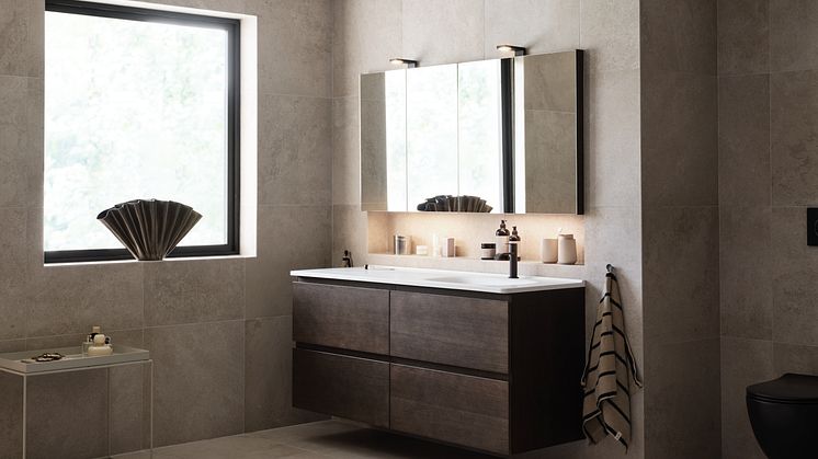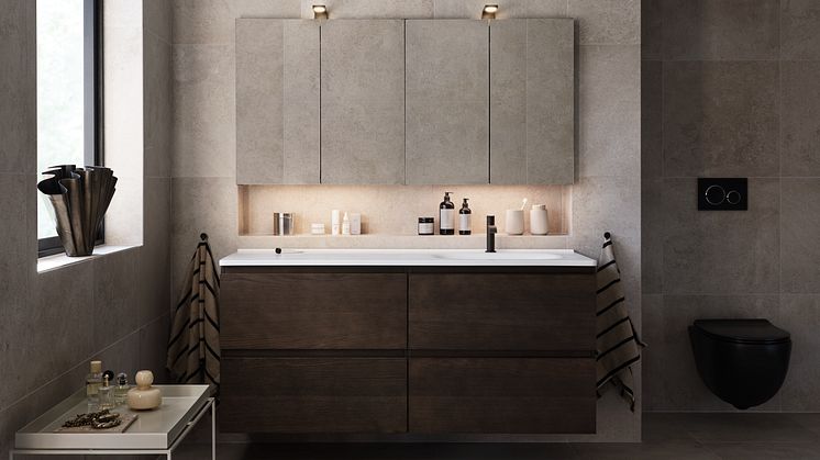 För den som fantiserar om ett tidlöst badrum med exklusiv känsla är Vedums nya brunbetsade badrumsmiljö allt man kan drömma om och lite till. I miljön syns den populära serien Flow som är lätt att älska genom sitt genuina och enkla formspråk. Den mörka eken skänker värme och karaktär till det sparsmakade och skandinaviska uttrycket.