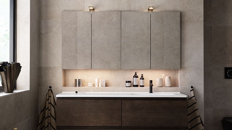 Varma naturtoner med gediget uttryck och exklusiv känsla – det är ledorden när svenska Vedum Kök & Bad lanserar årets andra badrumsmiljö. Den populära badrumsserien Flow, i brunbetsad ek ger en varm och välkomnande känsla. Det semi-infällda spegelskåpet med både över- och underbelysning rymmer massor av förvaring och ger ett platsbyggt intryck.