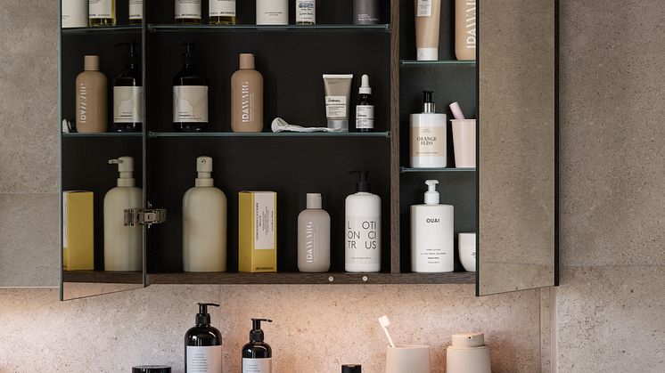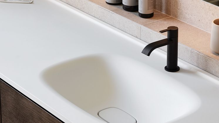 Flow erbjuds nu också i den nya bredden 1500 millimeter där man kan välja mellan höger- och vänsterställd ho. På så vis skapas en generös avställningsyta för produkter, tvål eller en kopp morgonkaffe för den som är i farten. Den nya lådindelningen Mejram i folierad vitpigmenterad ek förstärker badrummets eleganta utseende och hjälper till att hålla ordning och reda.