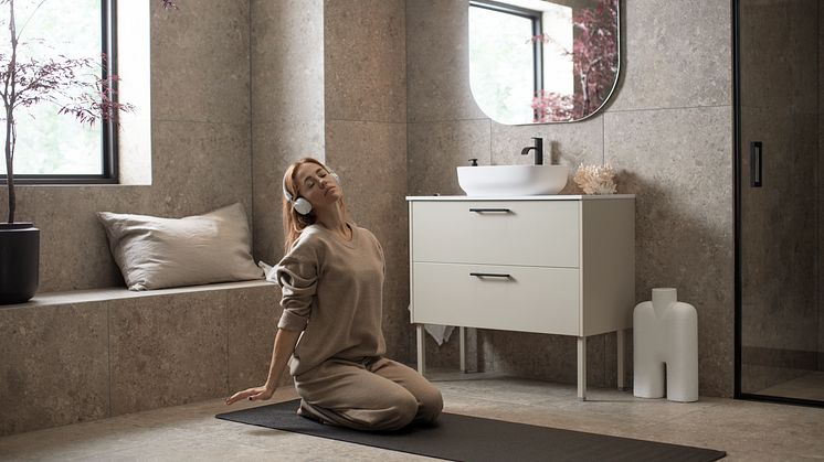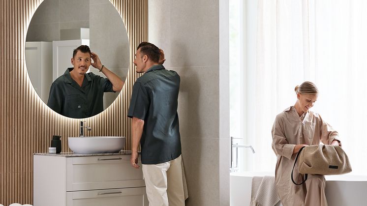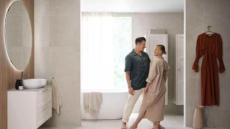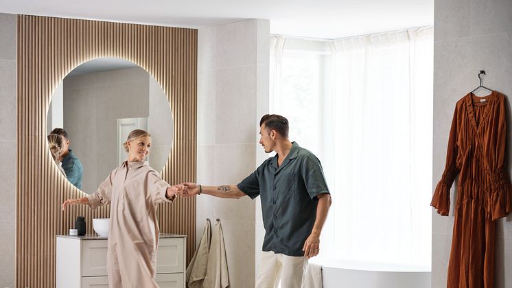 I 2023 års badrumsmiljö använder de professionella dansarna Henric och Joanna Stillman dansen för att komma i kontakt med kroppssinnet. De visar verkligen att det fungerar minst lika bra att bjuda upp till dans i Vedums badrum, som på världsscenerna.