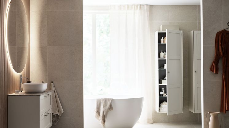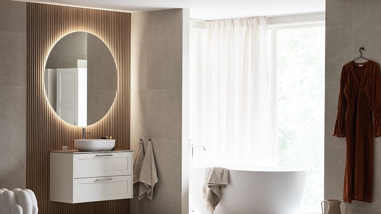 I år lanserar Vedum fler storlekar av de populära, runda speglarna – ett oslagbart sätt att skapa ljus och rymd i badrummet, eller vilket rum som helst. I Vedums nya badrumsmiljö syns en större modell av spegeln Mjörn med dimbar dekorbelysning och justerbar färgtemperatur som sätter stämningen. Kombinationen av raka och runda linjer, tillsammans med flera olika ljuskällor, ger rummet en mjuk och inbjudande karaktär.