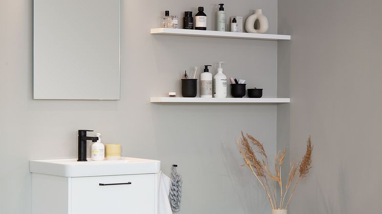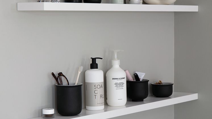 Vägghyllor och öppen förvaring är en ny favorit i badrummet. Vi vill få plats med allt från handplockade detaljer till favoritkrämen. -