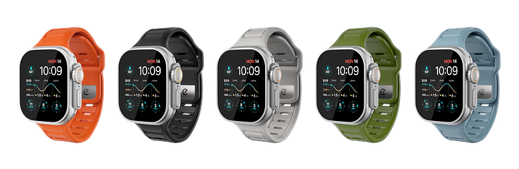 KeyBudz Apple Watch-armband är robusta band designade för Apple Watch Ultra men passar alla Apple Watch-modeller som mäter 44 till 49 millimeter. Armbandet är tillverkat av slitstarkt fluorelastomer (FKM-material) och är konstruerat för att klara extrema förhållanden.