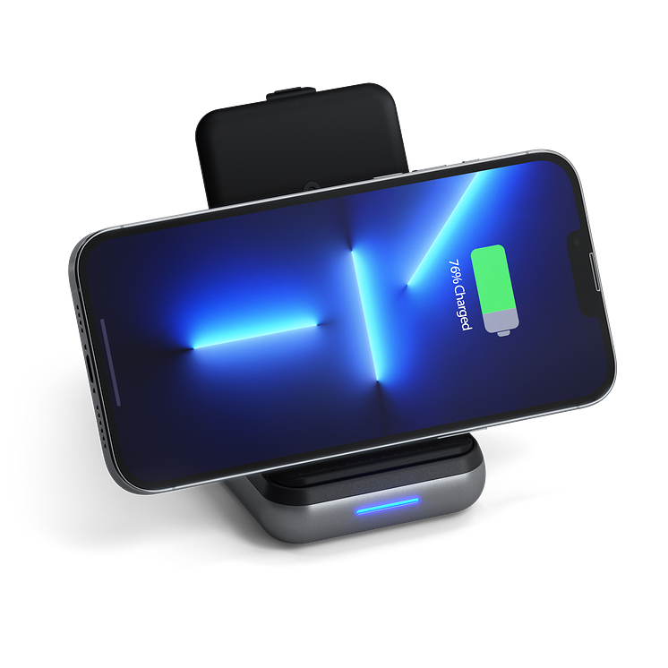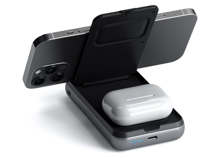 Med en kapacitet på 10000mAh som kan fördelas på upp till tre enheter. Vinkla upp stället för att ladda din iPhone upprätt. Samtidigt frigör du en trådlös laddare för dina AirPods under locket. Du kan samtidigt ladda en enhet via USB-C på powerbankens kortsida.