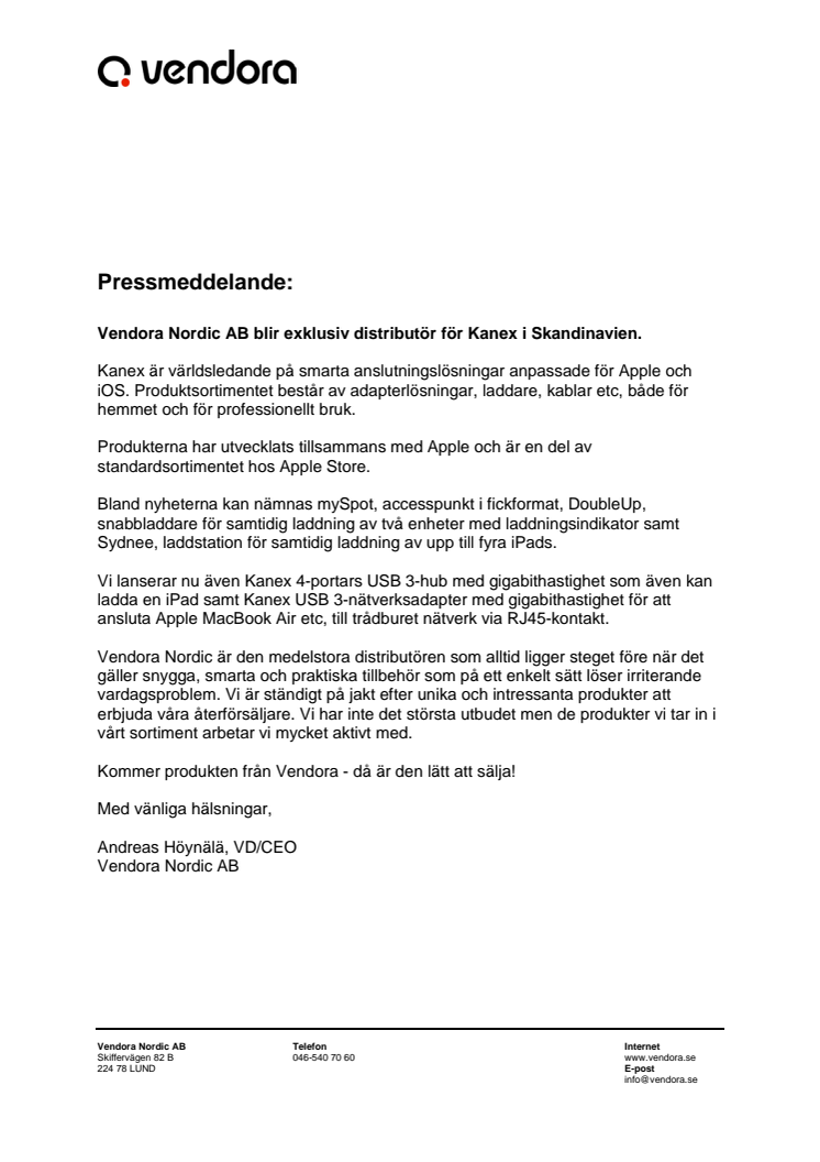 Vendora Nordic AB blir exklusiv distributör för Kanex i Skandinavien