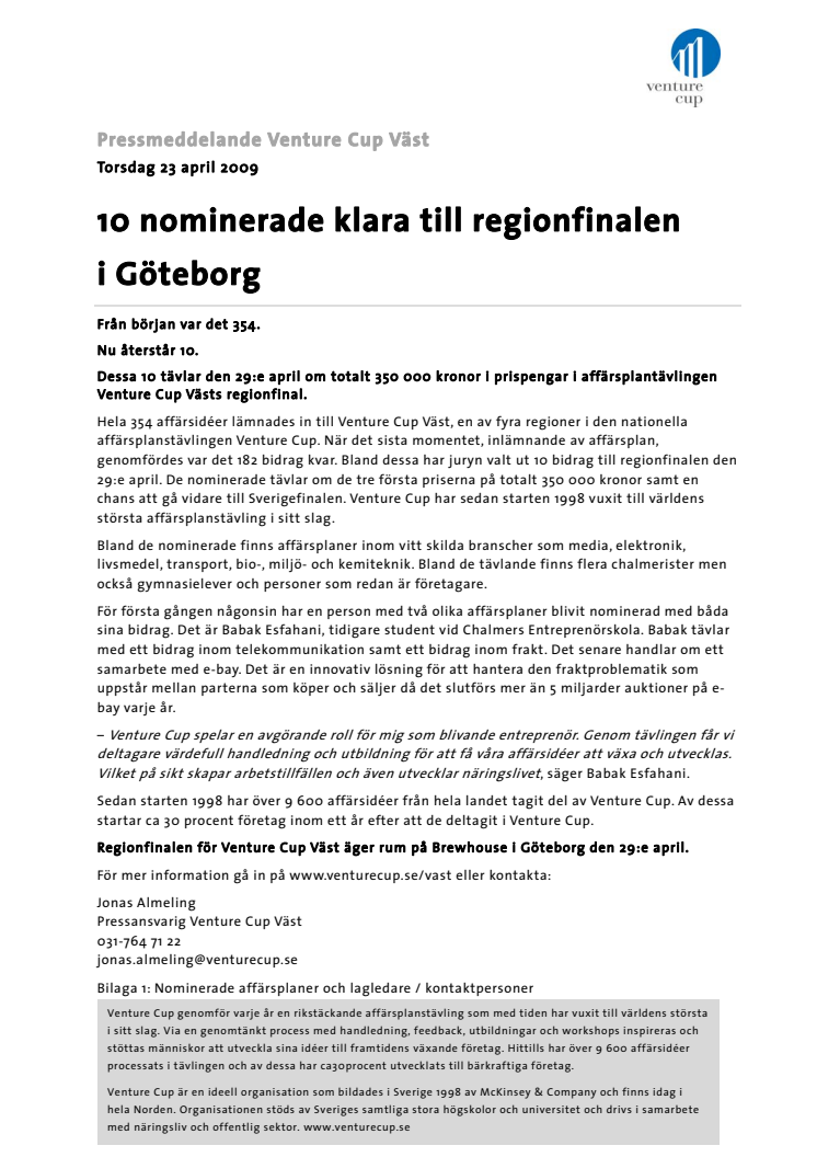 Dessa 10 tävlar den 29:e april om totalt 350 000 kronor i prispengar i affärsplantävlingen Venture Cup Västs regionfinal.