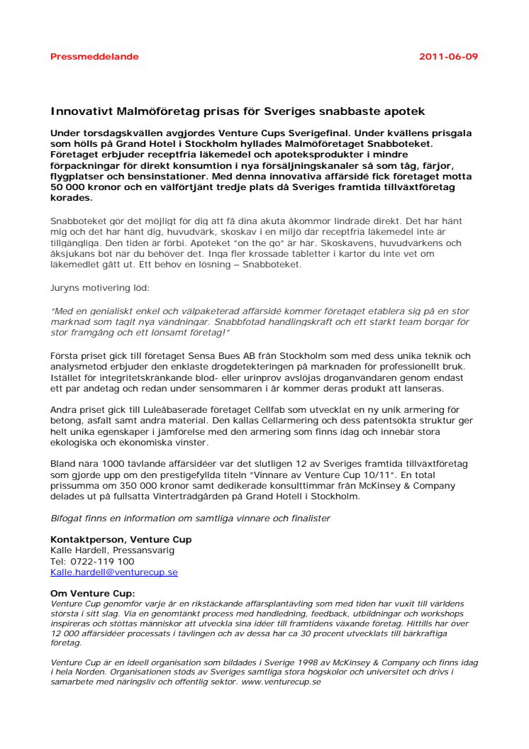 Under torsdagskvällen avgjordes Venture Cups Sverigefinal på Grand Hotel i Stockholm, där Malmöföretaget Snabboteket välförtjänt tog hem tredjepriset. Företaget erbjuder receptfria läkemedel och apoteksprodukter i mindre förpackningar för direkt konsumtion i nya försäljningskanaler så som tåg, färjor, flygplatser och bensinstationer.