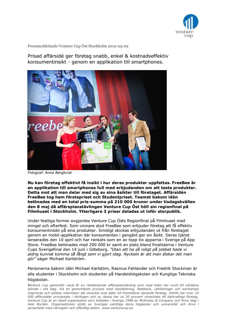 Nu kan företag effektivt få insikt i hur deras produkter uppfattas. FreeBee är en applikation till smartphones full med erbjudanden om att testa produkter. Detta mot att man delar med sig av sina åsikter till företaget. De belönades med en total pris-summa på 210 000 kronor den 8 maj på regionfinalen i affärsplanstävlingen Venture Cup Öst. Ytterligare 3 priser delades ut inför storpublik.