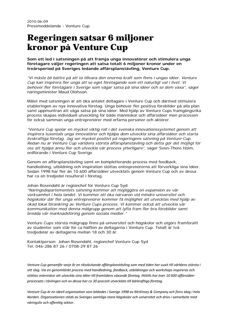 Som ett led i satsningen på att främja unga innovatörer och stimulera unga företagare väljer regeringen att satsa totalt 6 miljoner kronor under en treårsperiod på Sveriges ledande affärsplanstävling, Venture Cup.