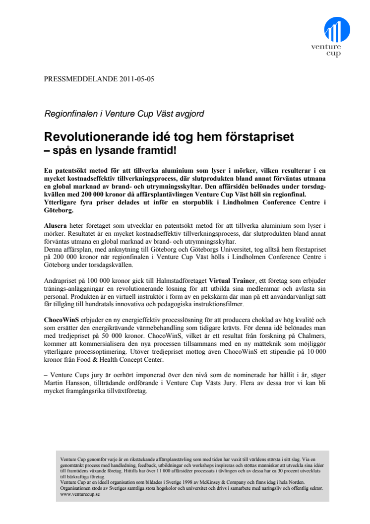 En patentsökt metod för att tillverka aluminium som lyser i mörker där slutprodukten bland annat förväntas utmana en global marknad av brand- och utrymningsskyltar. Den affärsidén belönades under torsdag-kvällen med 200 000 kronor då affärsplantävlingen Venture Cup Väst höll sin regionfinal. Ytterligare fyra priser delades ut inför en storpublik i Lindholmen Conference Centre i Göteborg.