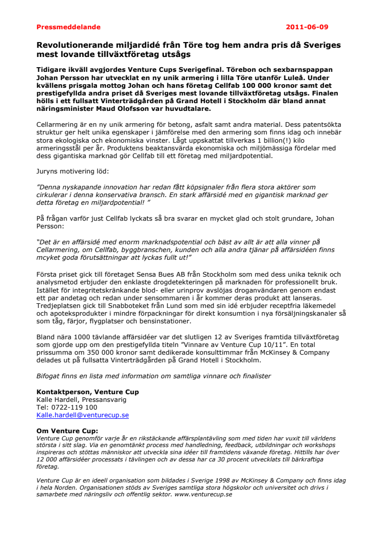 Tidigare ikväll avgjordes Venture Cups Sverigefinal. Törebon och sexbarnspappan Johan Persson har utvecklat en ny unik armering i lilla Töre utanför Luleå. Under kvällens prisgala mottog Johan och hans företag Cellfab 100 000 kronor samt det prestigefyllda andra priset då Sveriges mest lovande tillväxtföretag utsågs. Finalen hölls i ett fullsatt Vinterträdgården på Grand Hotell i Stockholm.
