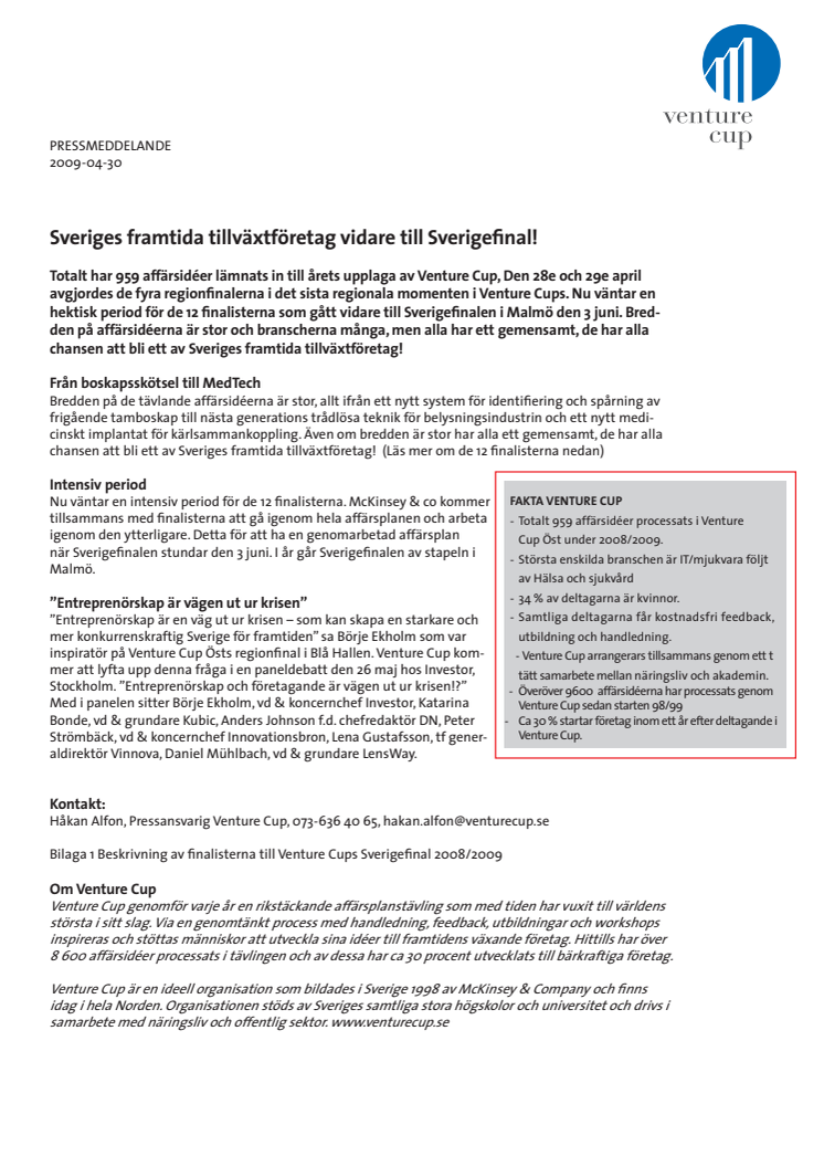 Totalt har 959 affärsidéer lämnats in till årets upplaga av Venture Cup, Den 28 och 29 april avgjordes de fyra regionfinalerna i det sista regionala momenten i Venture Cup. Nu väntar en hektisk period för de 12 finalisterna som gått vidare till Sverigefinalen den 3 juni. Bredden på branscherna är många, men alla har ett gemensamt, alla har chansen att bli ett av Sveriges framtida tillväxtföretag!